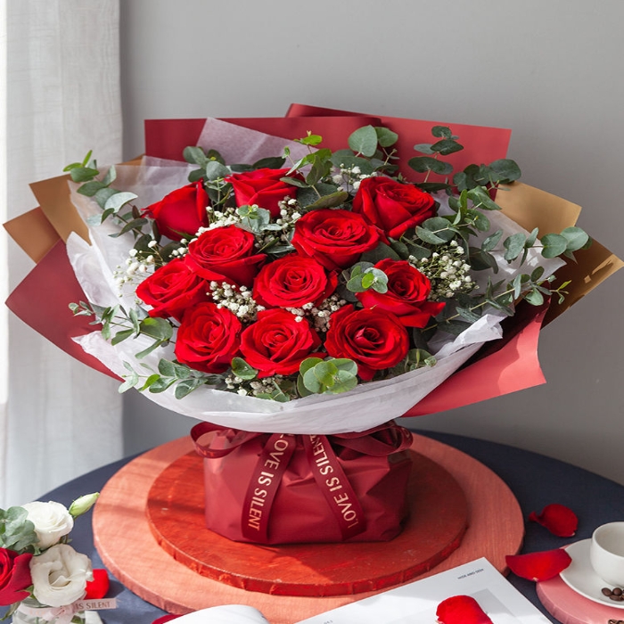 卡罗拉红玫瑰11枝,满天星、尤加利