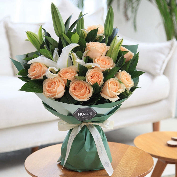 11枝香槟玫瑰,白色多头百合2枝