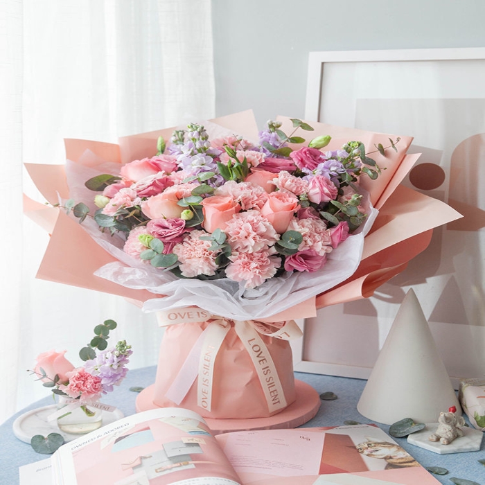 粉色康乃馨13枝,戴安娜玫瑰5枝、粉色洋桔梗5枝、浅紫紫罗兰5枝、尤加利10枝