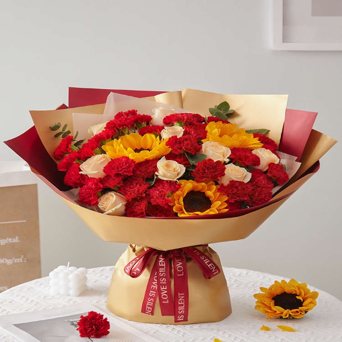 红康乃馨33枝、香槟玫瑰9枝、向日葵3枝
