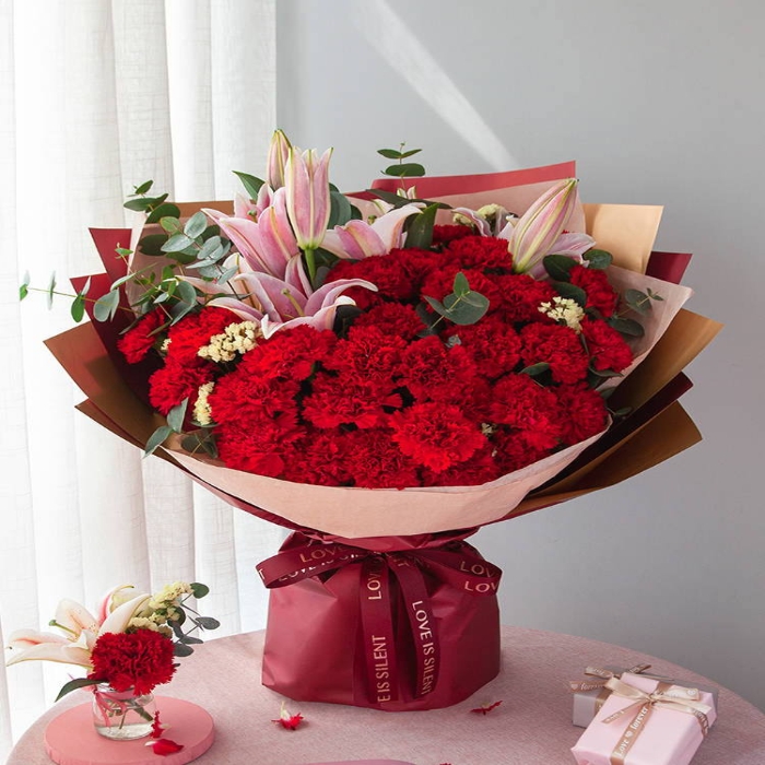 红色康乃馨29枝、粉色百合3枝、黄色勿忘我3枝、尤加利10枝