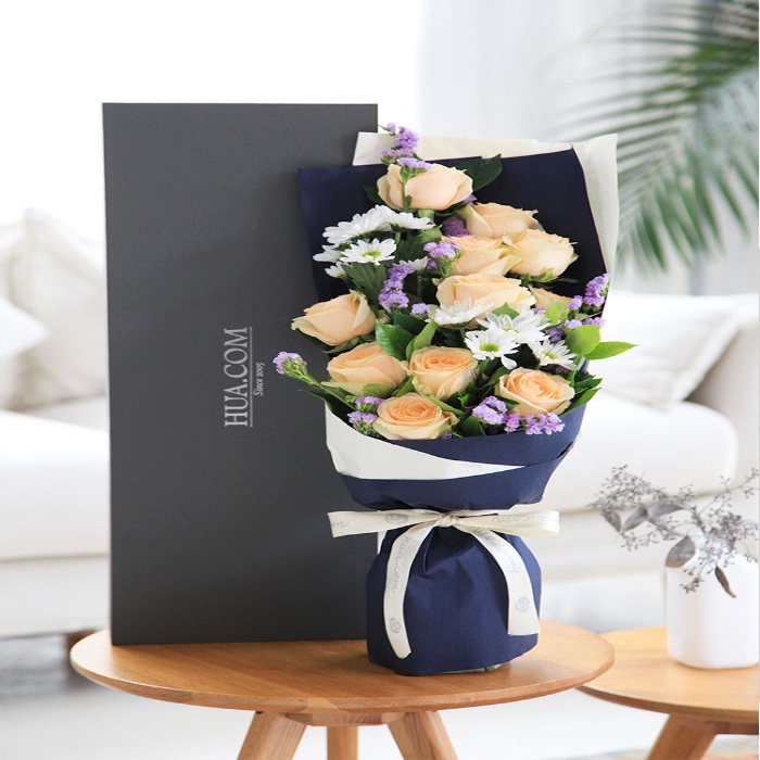 香槟玫瑰11枝、白色小雏菊3枝