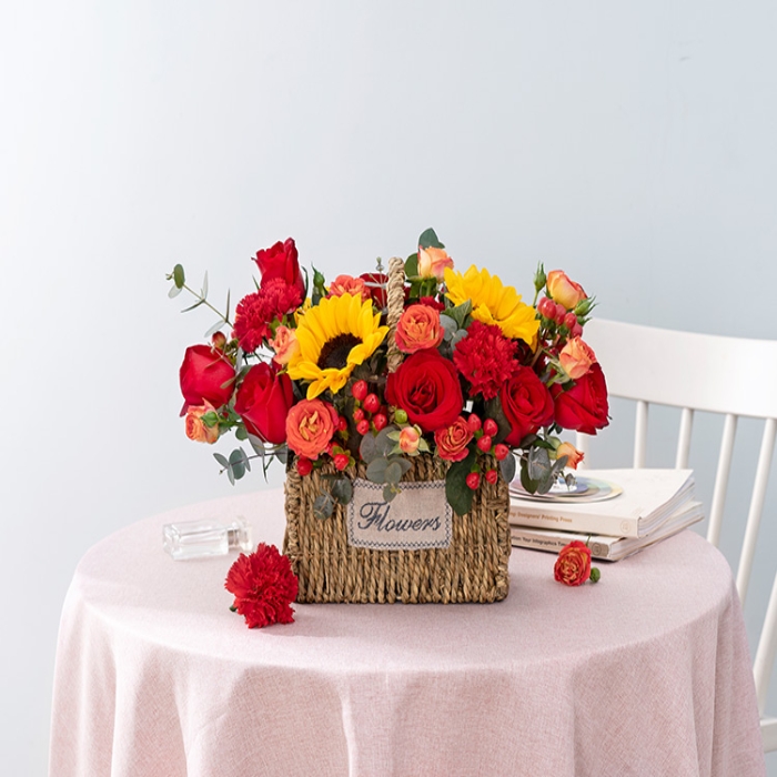红色康乃馨11枝、卡罗拉红玫瑰11枝、向日葵3枝